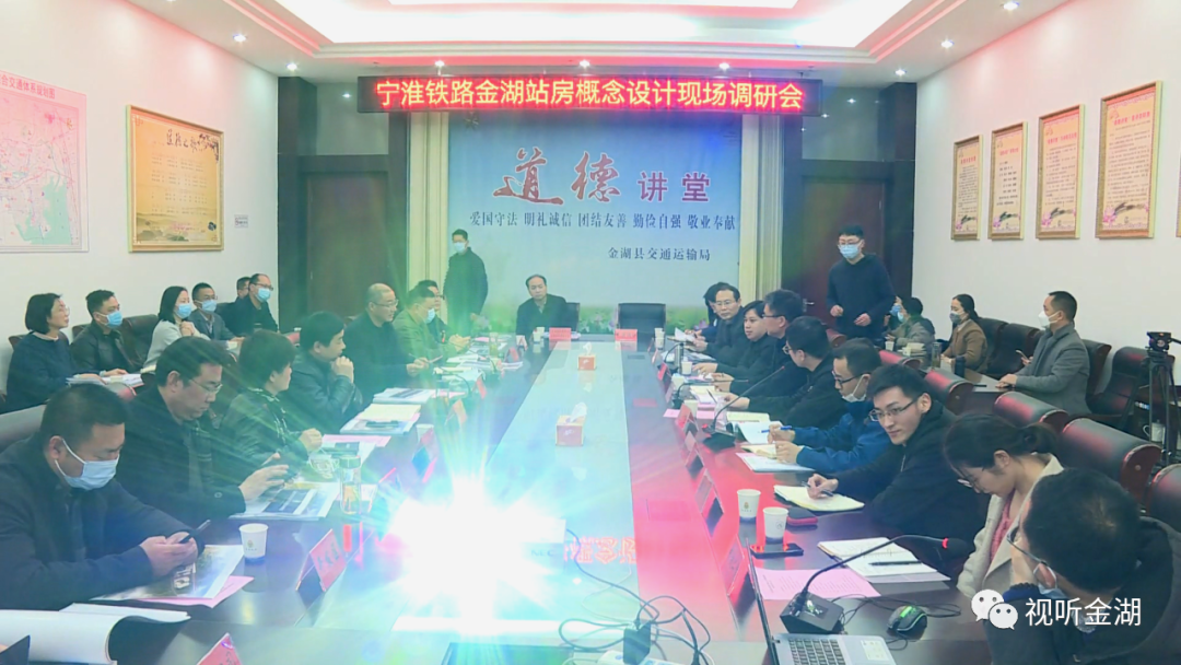 调研中,省铁路集团调研人员查看了金湖站房选址,介绍了宁淮铁路推进情况,设计单位汇报了金湖站房设计方案。